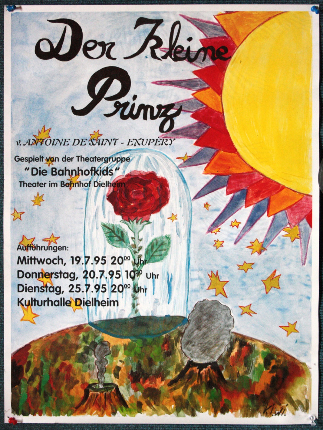 Der Kleine Prinz (1995) Regie: Jutta Werbelow Schauspieler: Die Bahnhofkids Musik: HjWidmer mit Schülerinnen und Schülern der Musikschule Aufführungen in der Kulturhalle Dielheim, offene Bühne, die „Planeten“ in der Halle verteilt. Die Musik – Szenenmwechselnmusiken zu den jeweiligen Reisen – wurde mit mehreren Tasteninstrumenten live gespielt Zu den Stationen und … Weiterlesen …